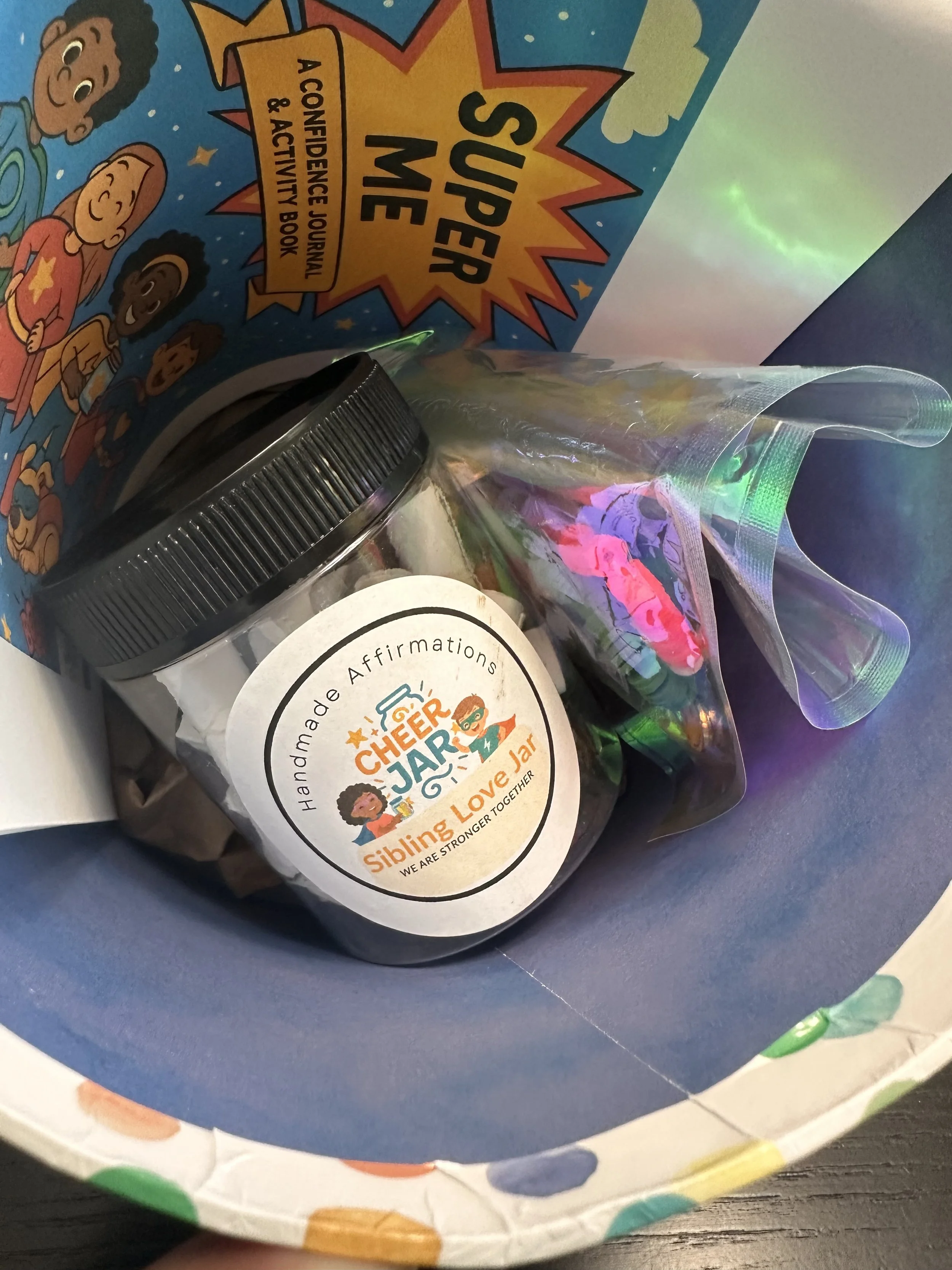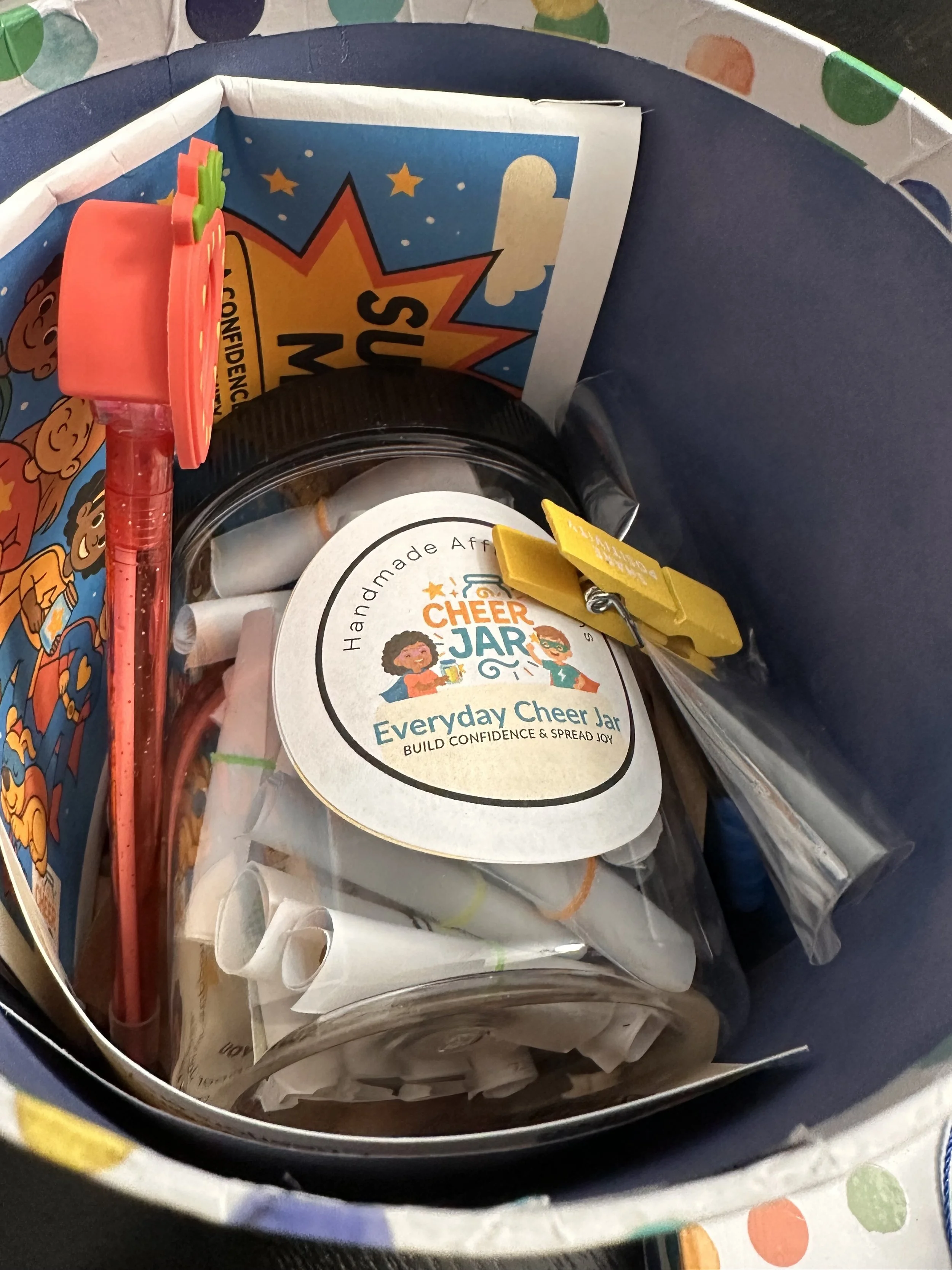 Categories: All Affirmation Jars Bedtime calm jar Everyday Cheer Jar Sibling Love Jar Joy bands Journal Gift Bundle All / Quick View CHEER JAR GIFT BUNDLE – A Mix of Cheer Jar Favorites & Fun Surprises $25.00